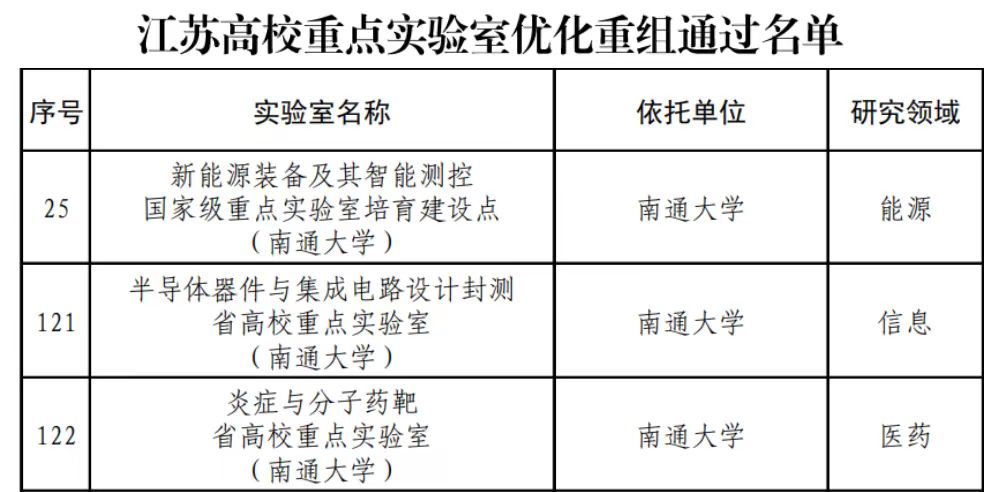 1月底,江苏省教育厅公布省高校重点实验室优化重组通过名单。公司新能源装备及其智能测控、半导体器件与集成电路设计封测、炎症与分子药靶等三个省高校重点实验室全部通过评审。