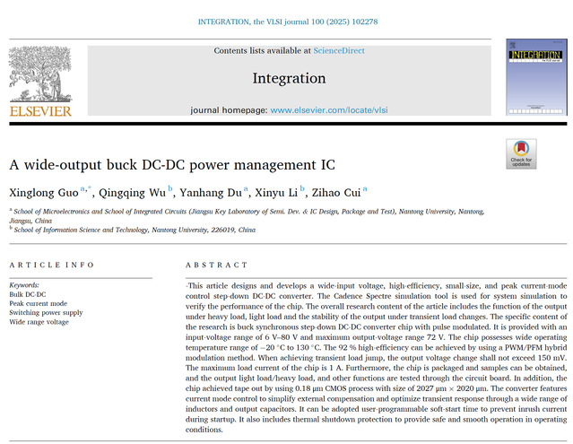 随着信息技术的发展,计算机设备、移动电话、智能手环、轻便无线通讯等便携式设备的尺寸越来越小,集成的功能越来越多,要求设备电源系统具有较小的尺寸和成本,能够高效率的提供更多能量,对电源管理芯片的需求日益增加,因此迫切需求有关的电源管理芯片。据此需要,william威廉中文官网郭兴龙教授设计研究了一款高效率、小尺寸的峰值电流模控制的降压型DC-DC变换器。此研究论文《A Wide-Output Buck DC-DC Power Management IC》于2024年9月6日在线发表于期刊《Integration》上,论文第一作者为郭兴龙教授,第一单位为william威廉中文官网。